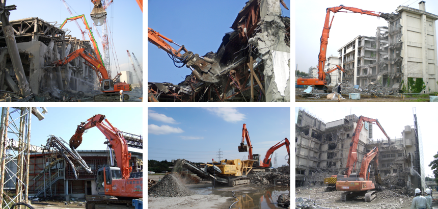 超大型の重機を地上に設置して、地上から圧砕作業を行うという解体工法です。アーム部分にカメラを取り付けることで先端の圧砕作業をモニタリングしながら進めることができ、弊社の超大型ハイリフト重機を使用すると、地上40メートル(13階建て)までの建物が解体できます。建物を地上から砕き、鉄筋、鉄骨を切断していく。低騒音、低振動の工法です。 |